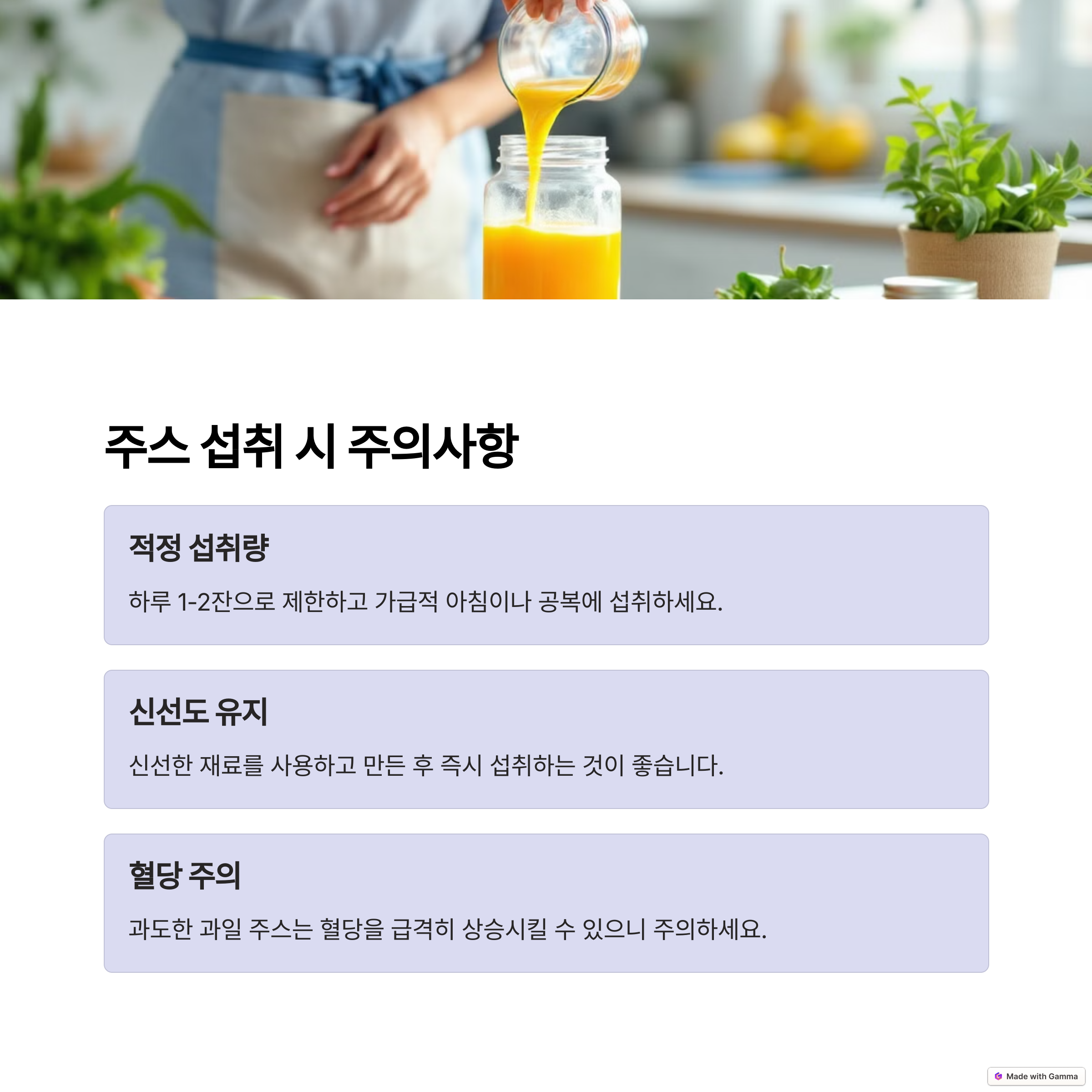 건강 주스는 면역력 강화, 소화 개선, 피부 상태 개선 등 다양한 건강상의 이점을 제공합니다. 비타민 C가 풍부한 과일과 채소를 활용하면 면역 체계가 강화되고 피로가 줄어듭니다. 꾸준히 건강 주스를 마시면 몸이 가벼워지고 활력이 넘치는 삶을 누릴 수 있습니다.