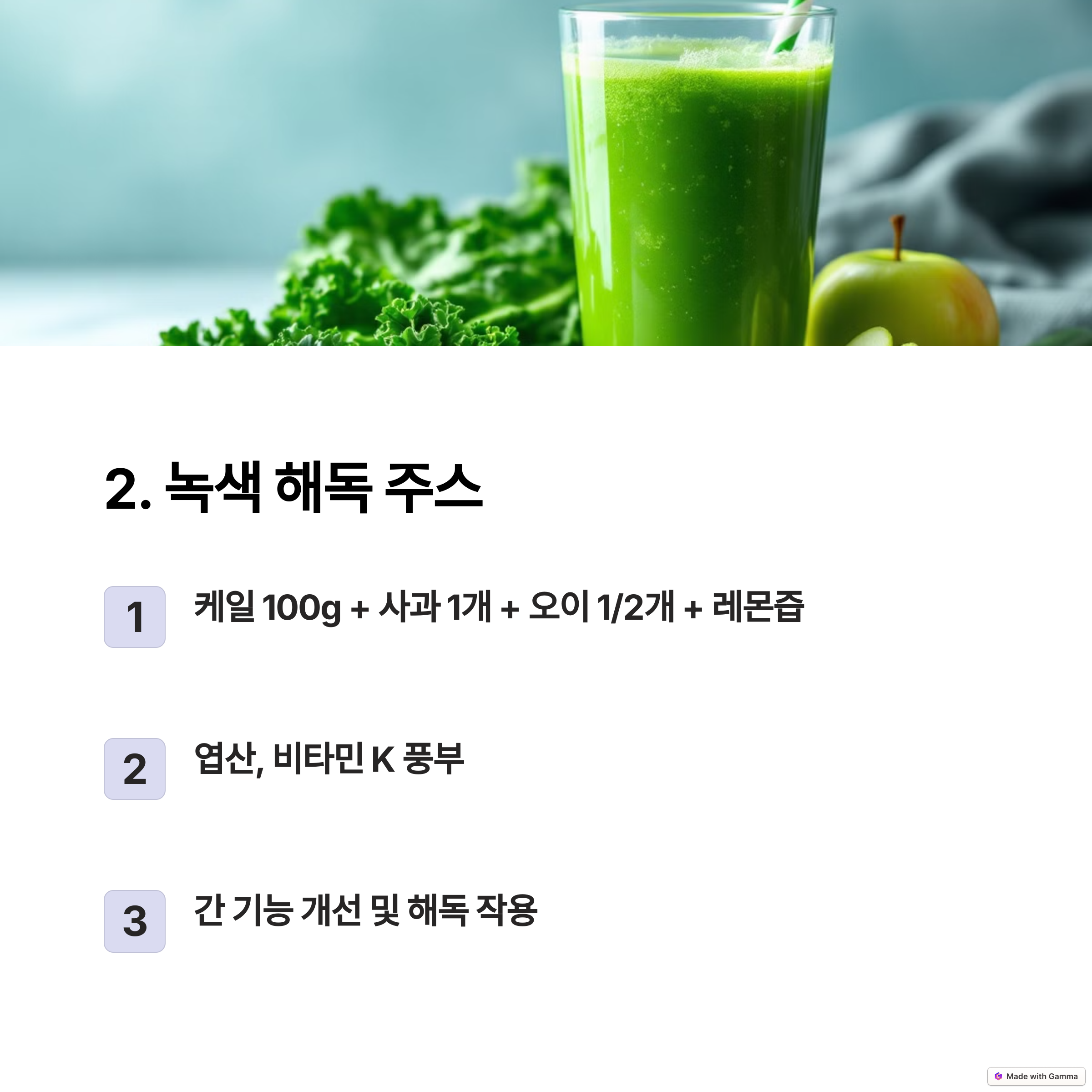 해독 주스는 몸 속의 독소를 배출하고 체내 환경을 깨끗하게 만듭니다. 케일, 시금치, 사과, 레몬 등을 활용한 해독 주스는 장 건강을 개선하고 피부 상태를 맑게 합니다. 특히 케일은 엽산과 비타민 K가 풍부해 면역력 강화에 큰 도움을 줍니다. 매일 아침 해독 주스를 섭취하면 몸이 가벼워지고 활력이 넘치는 것을 느낄 수 있습니다.